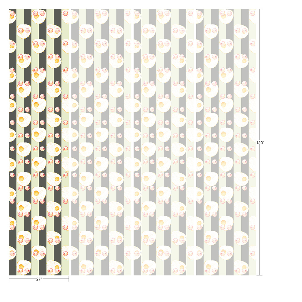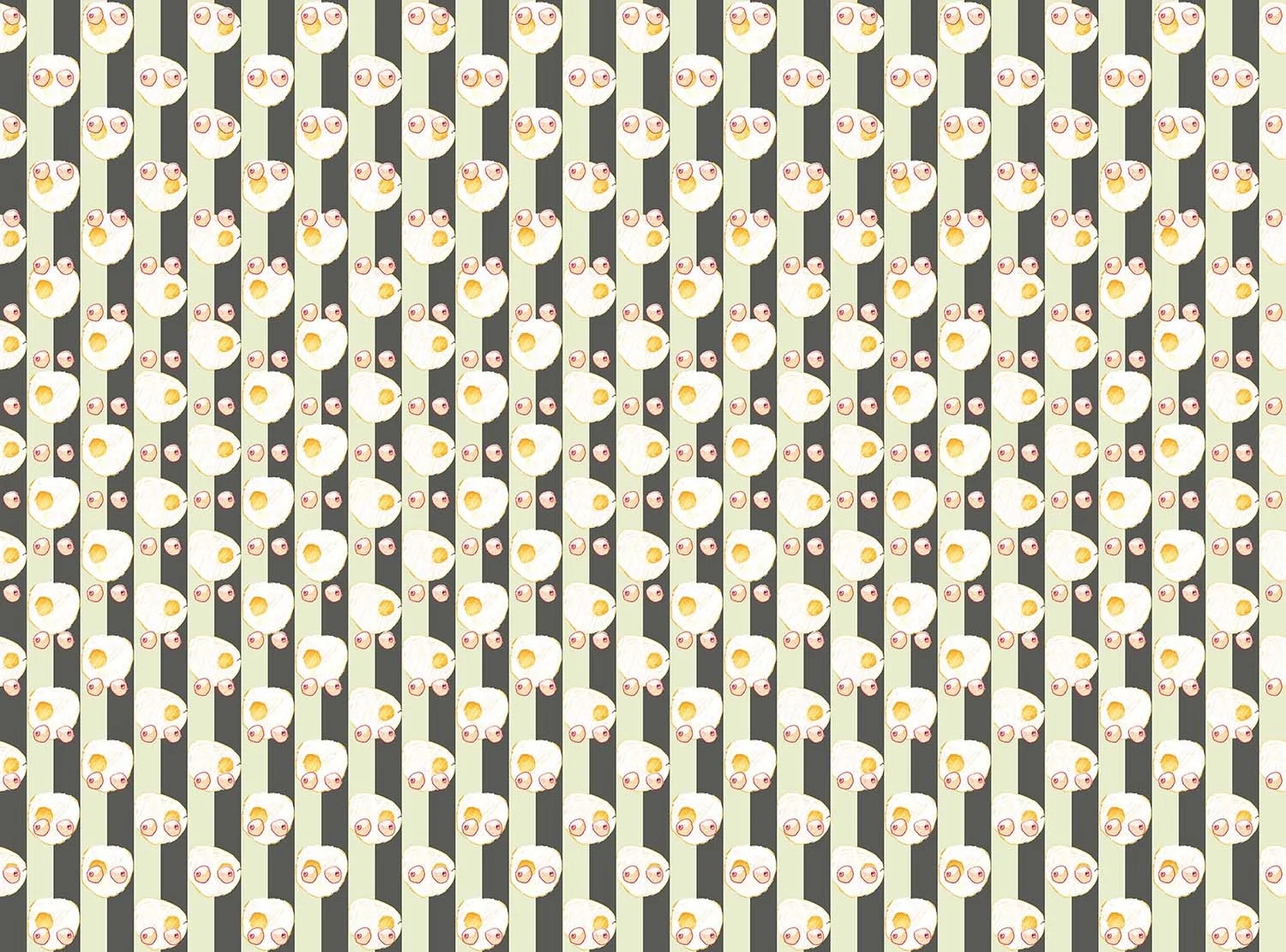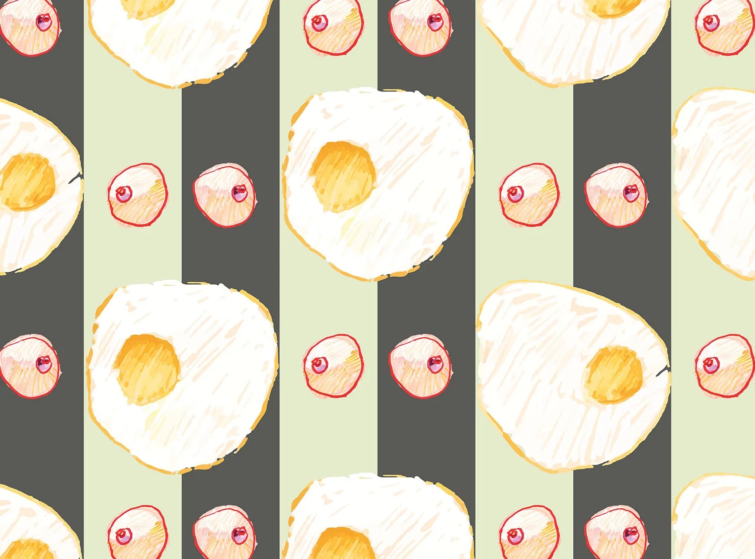 Fried eggs and breasts create a polka dot repeat in this design inspired by eating breakfast in bed.