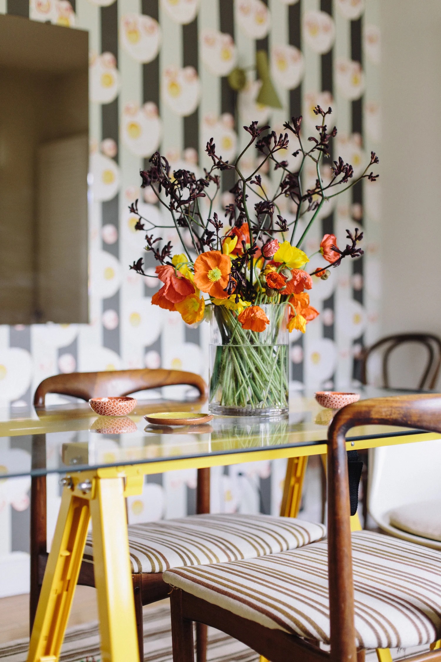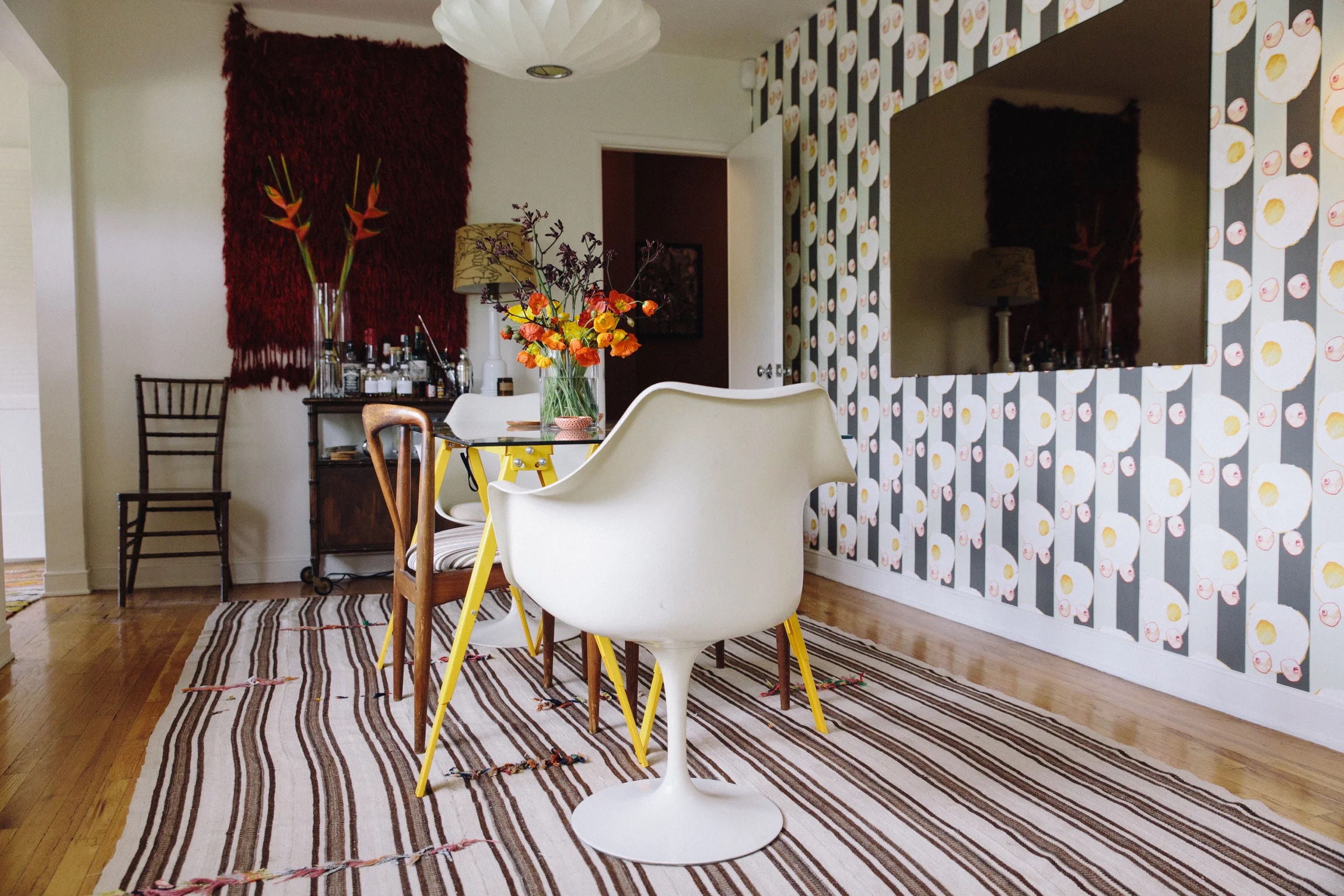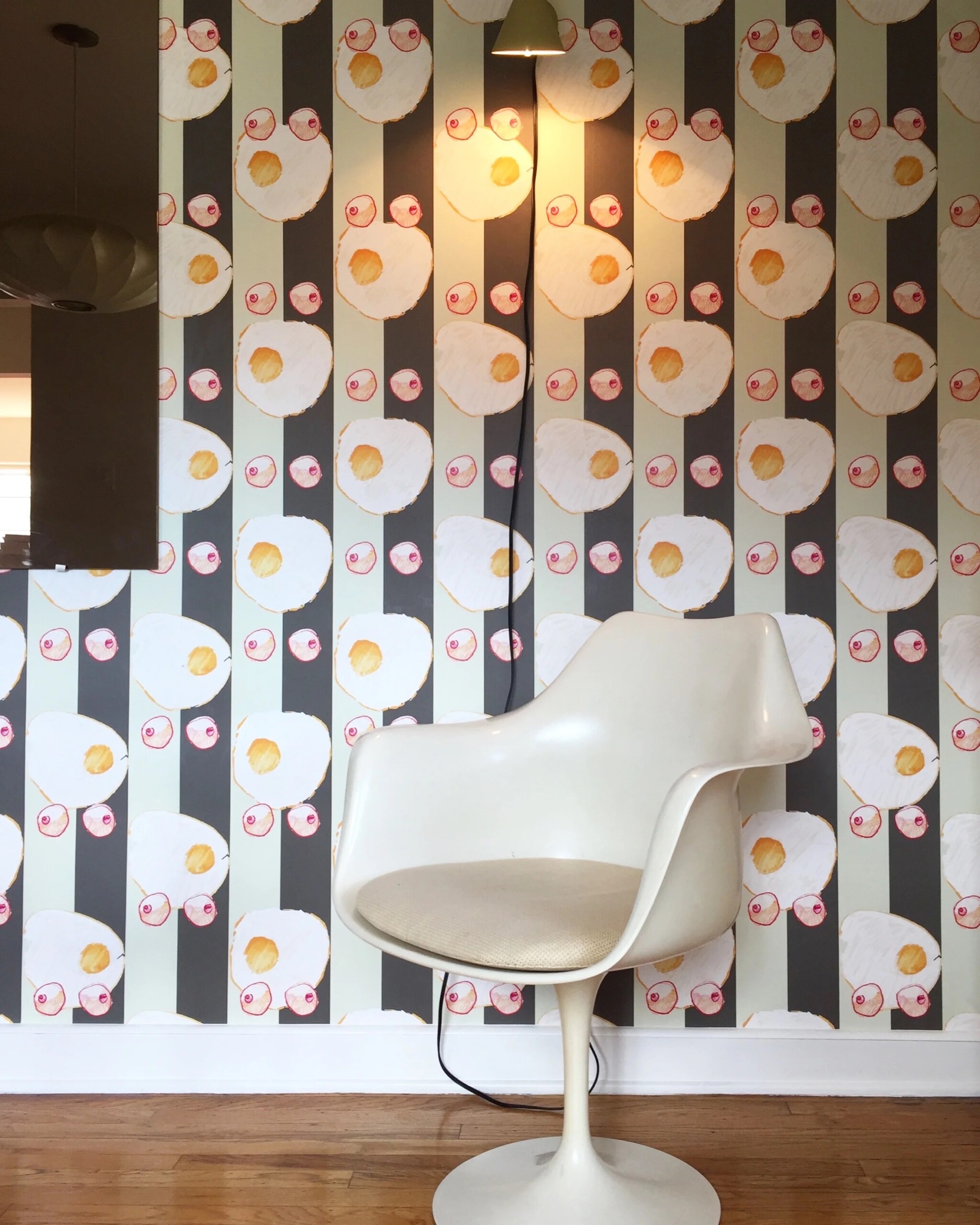 Fried eggs and breasts create a polka dot repeat in this design inspired by eating breakfast in bed.