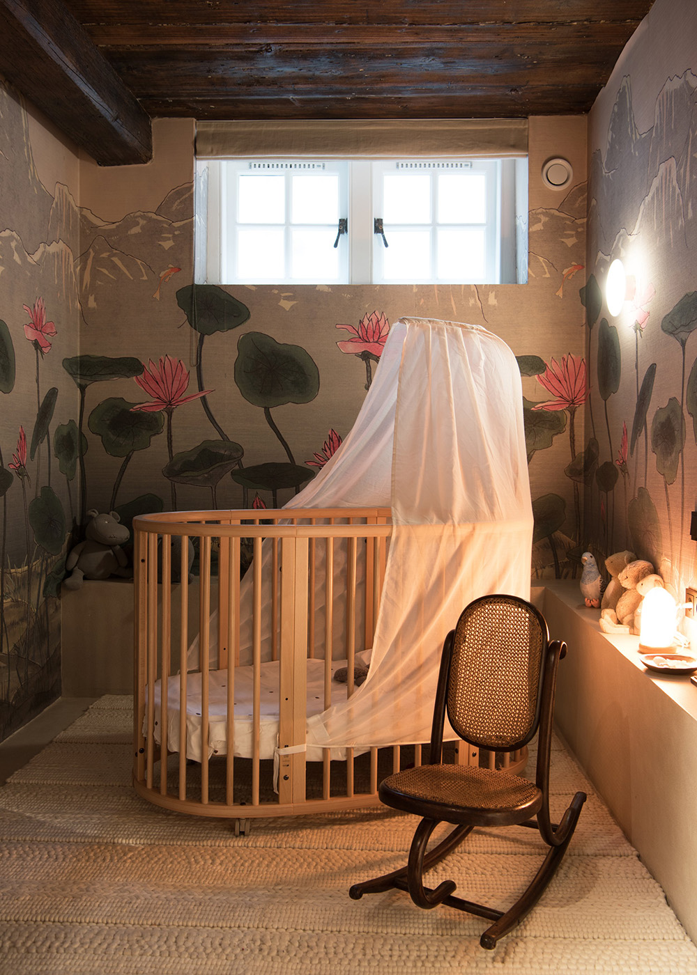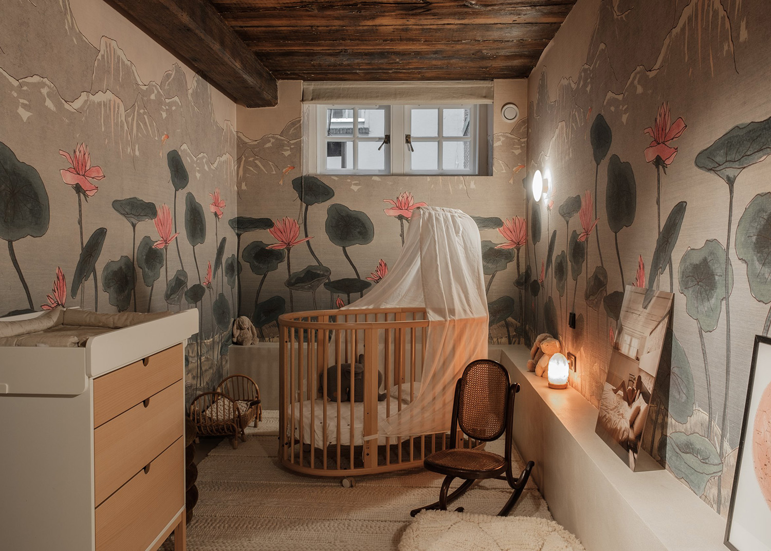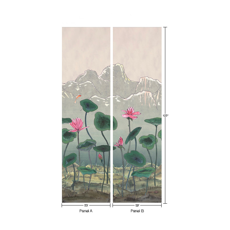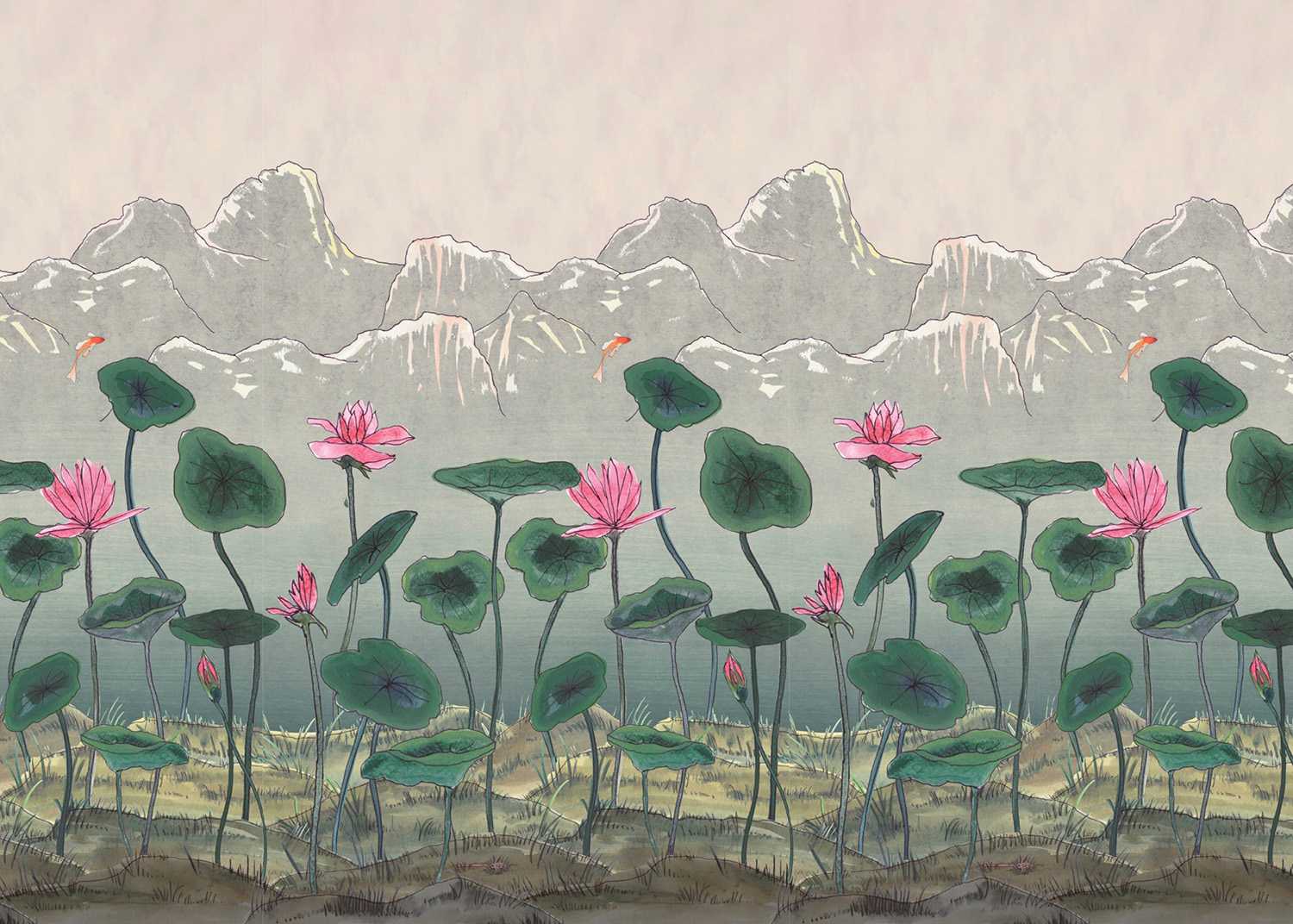 An oversized floral landscape where towering lotus stems and lush blooms rise against misty mountains. Hidden throughout this serene scene, symbolic details hint at untold stories waiting to be discovered.