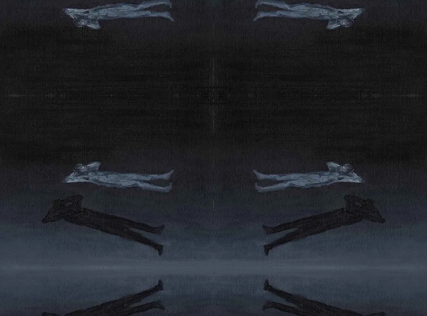 Inspired by a dream of a man levitating in the night sky, creating a water-like reflection in a lunar atmosphere.