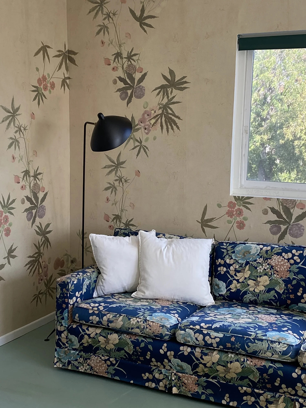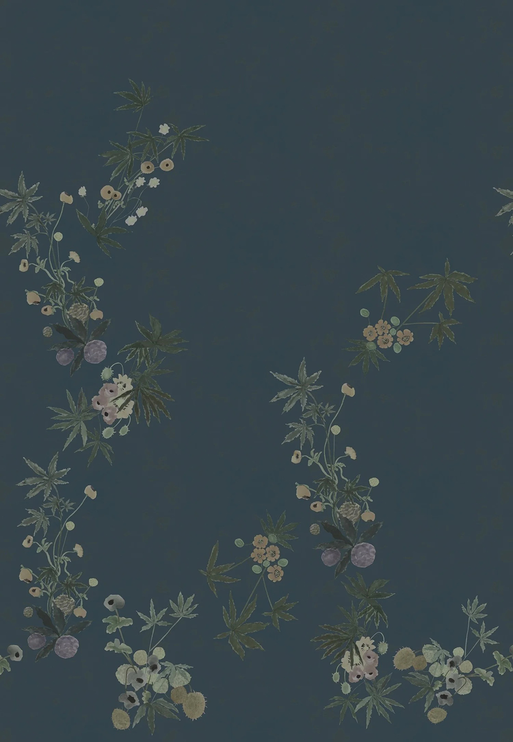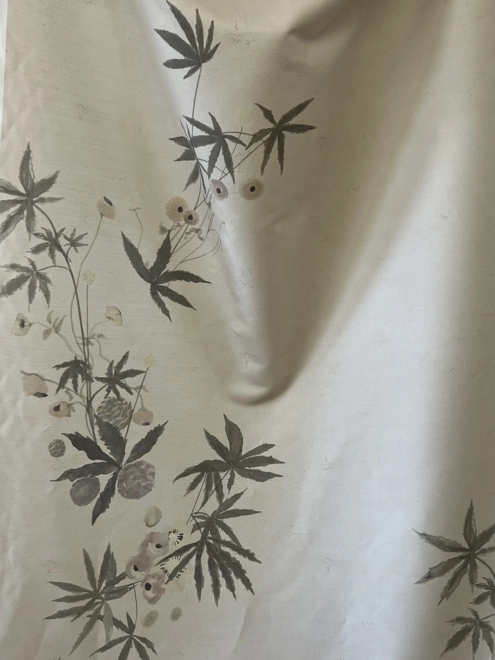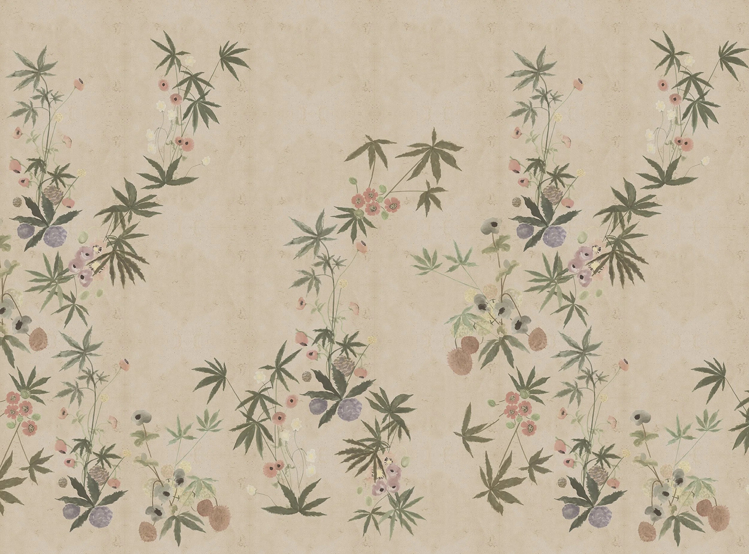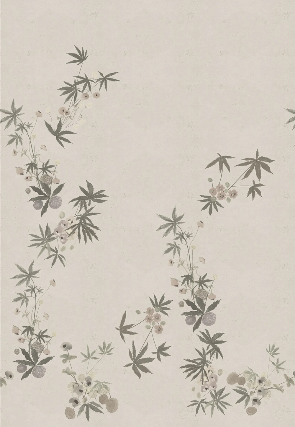 An imagined ikebana flower arrangement featuring cannabis leaves in shoji inspired tones.